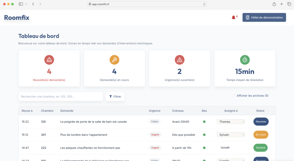 Dès les premiers jours d’utilisation, Roomfix apporte plus de visibilité, une meilleure organisation des interventions, tout en soulageant la réception et en améliorant rapidement l’efficacité du service technique.